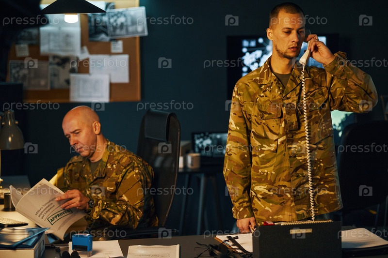 Солдаты, управляющие коммуникациями в офисной обстановке