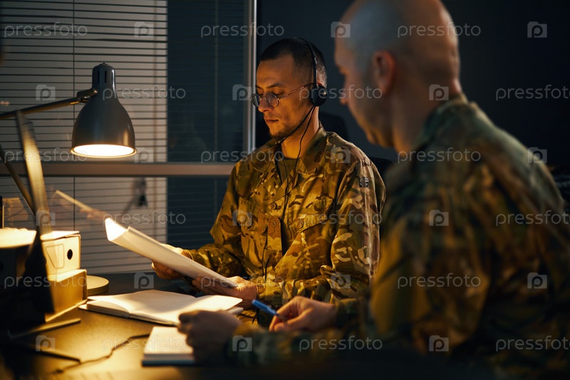Военный персонал просматривает документы под настольной лампой
