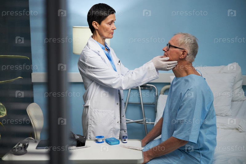 Медицинский профессионал, осматривающий пожилого пациента в больничной палате