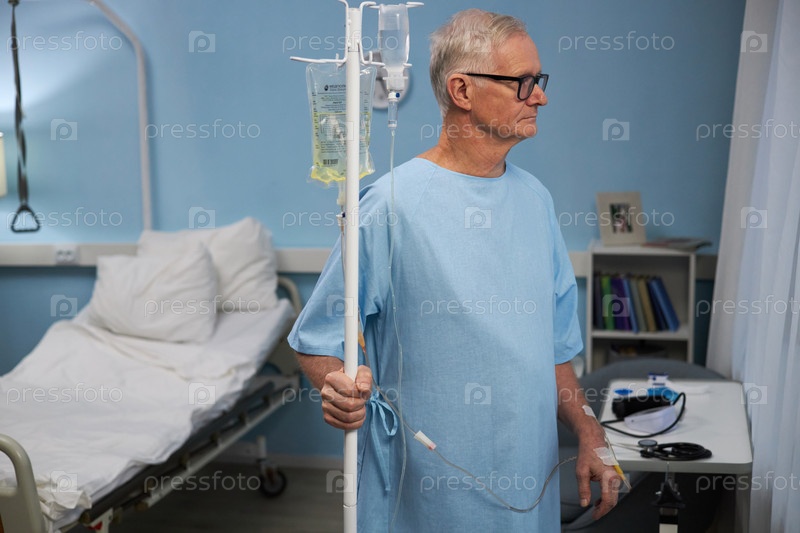 Пожилой мужчина, стоящий рядом с больничной кроватью Holding IV Stand