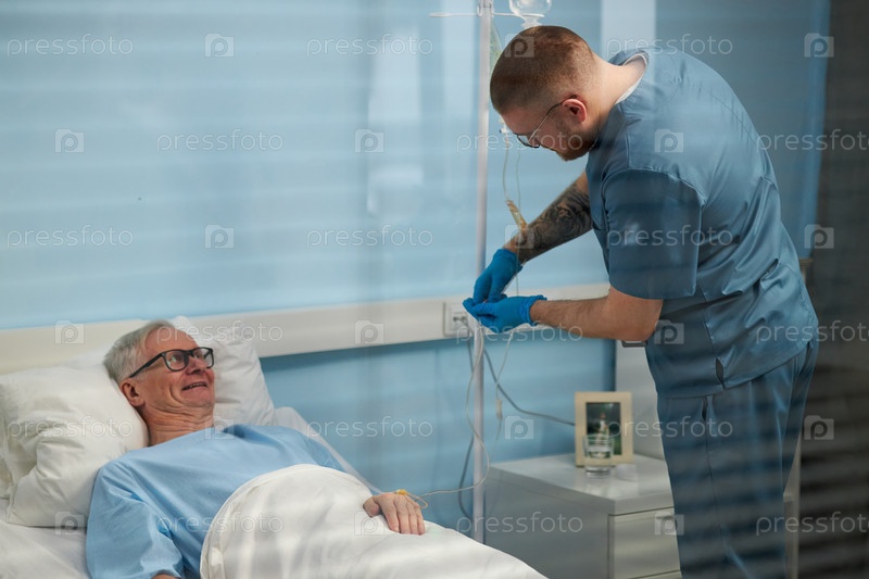 Пожилой пациент, получающий внутривенную терапию в больничной палате
