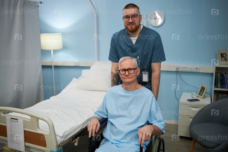 Улыбающаяся медсестра помогает пожилому пациенту в больничной комнате