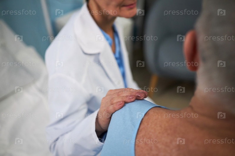 Профессионал, осматривающий плечо пациента в клинической медицинской обстановке