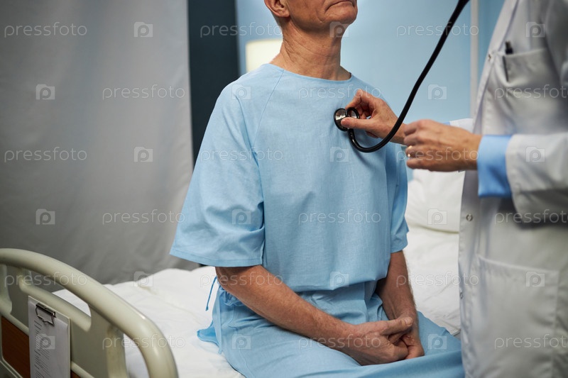 Обследование пожилого пациента с помощью стетоскопа в больничной комнате