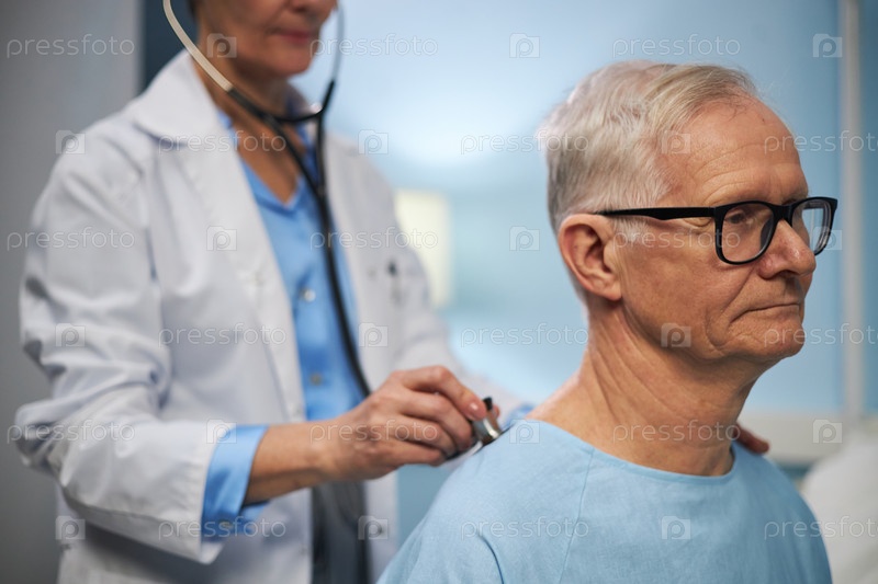 Проверка сердцебиения пожилого пациента с помощью стетоскопа