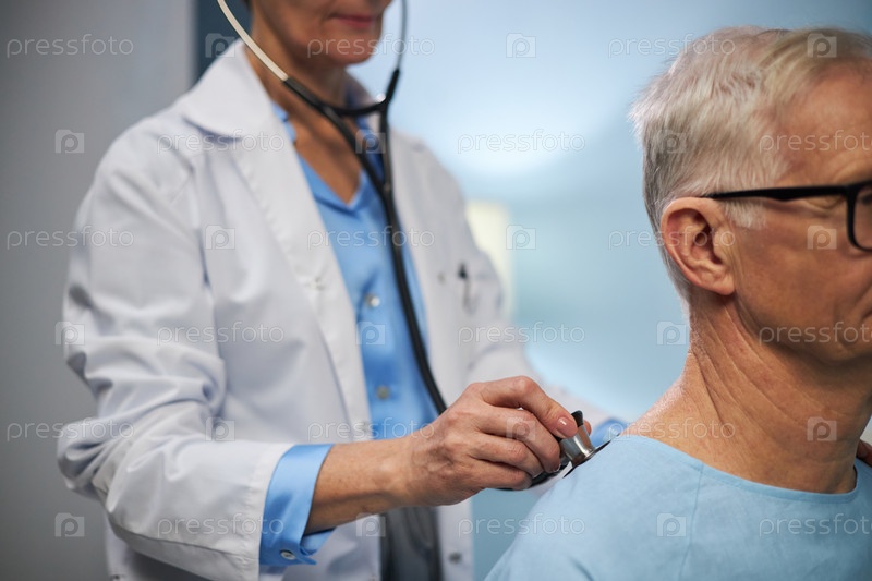 Пожилой мужчина проходит медицинское обследование с помощью врачебного стетоскопа