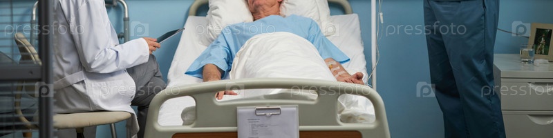 Врач, заботящийся о пожилом пациенте в больничной постели