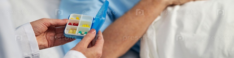 Хранение коробки с организатором таблеток во время оказания помощи пациенту