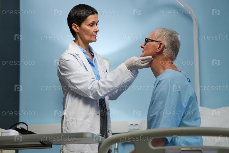 Медицинский профессионал, осматривающий пожилого пациента в больничной палате