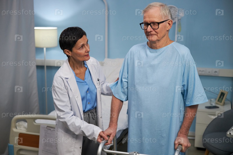 Врач, помогающий пожилому пациенту в больничной комнате
