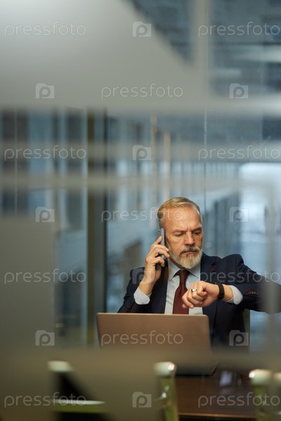 Бизнесмен проверяет время во время телефонного звонка