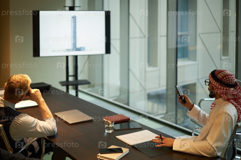 Ближневосточный мужчина дает презентацию инвестору