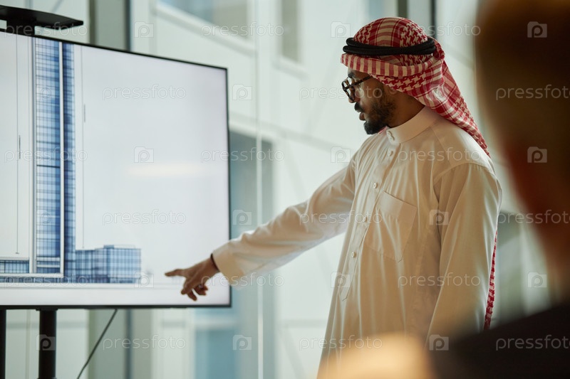 Инвестор смотрит на ближневосточный коллега, дающий презентацию