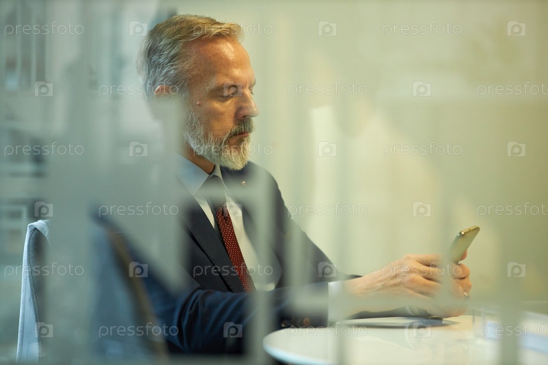 Зрелый генеральный директор проверяет сообщения на смартфоне