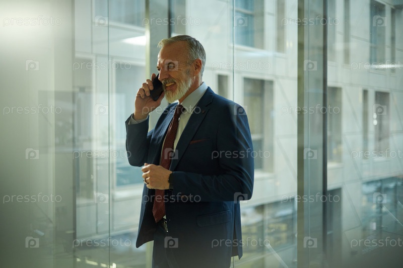 Веселый бизнесмен делает телефонный звонок