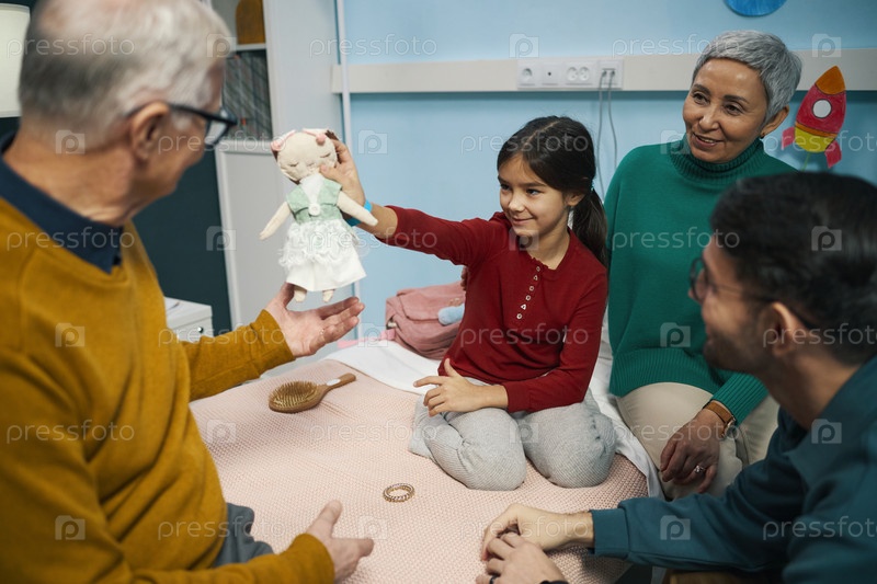 Маленькая девочка играет со своей семьей в больнице