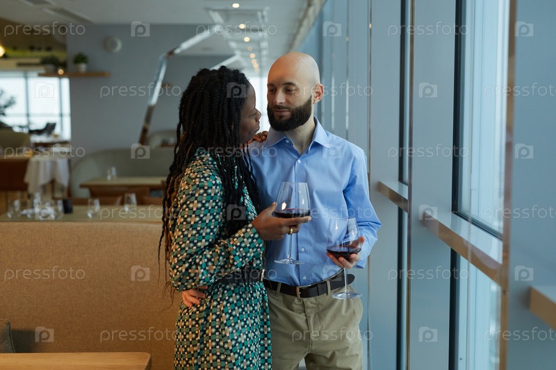 Мультиэтническая пара пьет вино в ресторане