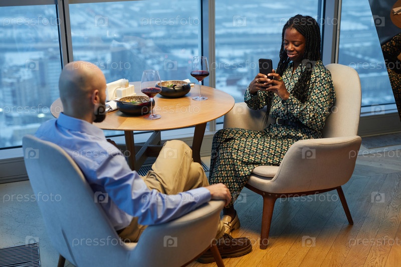 Женщина делает фото ужина на мобильном телефоне