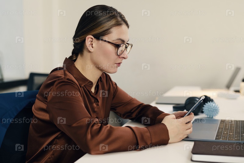 Деловая женщина использует смартфон на своем рабочем месте