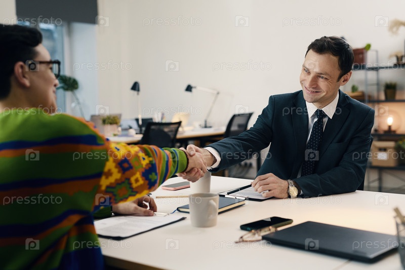 Бизнесмен пожимает руку сотруднике на встрече