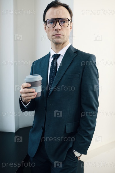 Бизнесмен в костюме пьет кофе