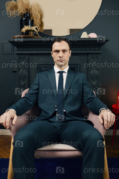 Бизнесмен в костюме сидит на стуле в офисе