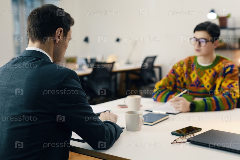 Бизнесмен читает резюме кандидата на встрече