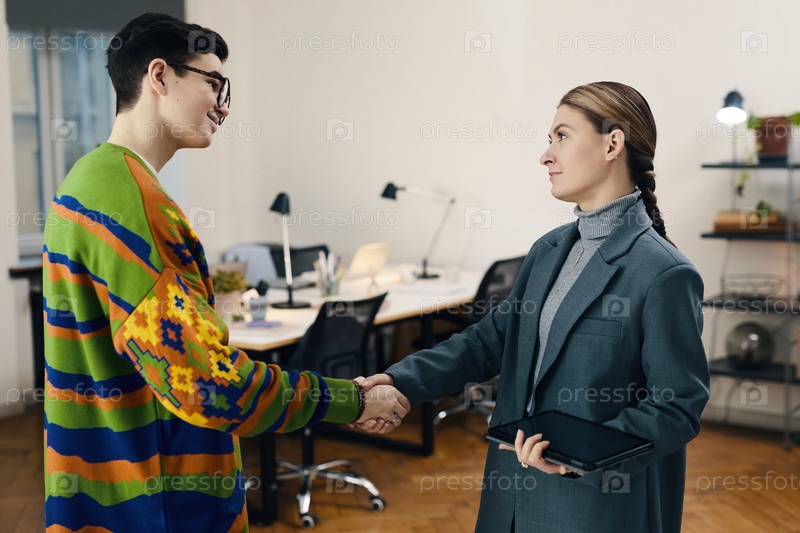 Деловая женщина пожала руку сотруднику в офисе