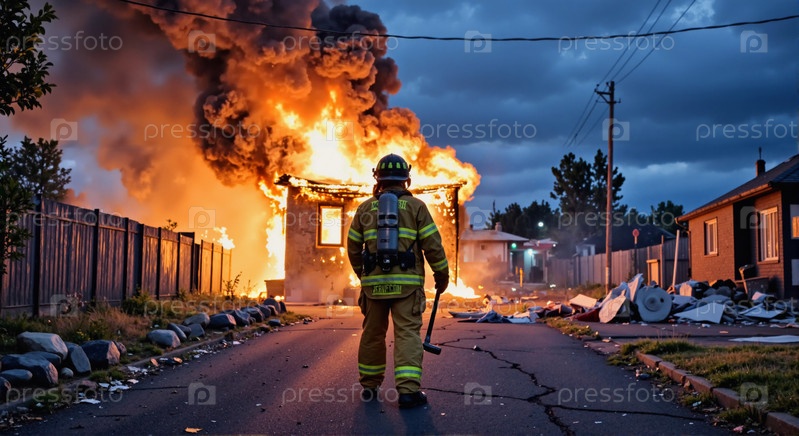 Пожарный приближается к горящему дому в пригородной зоне
