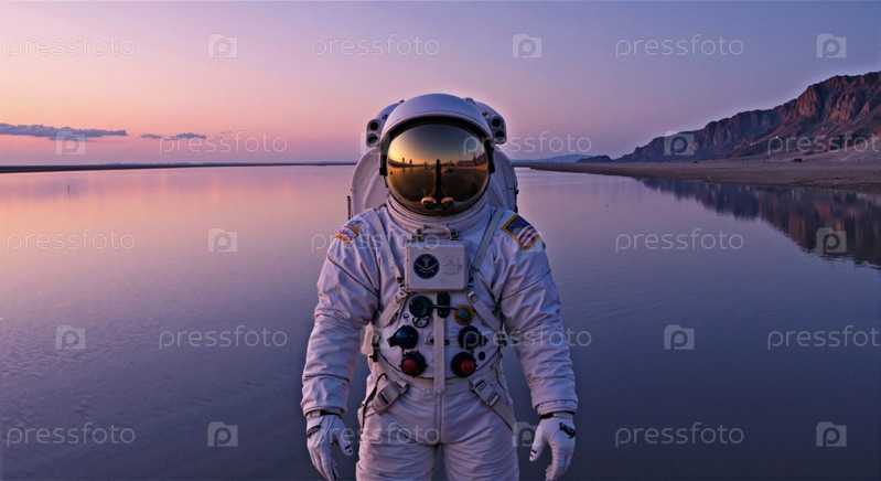 Астронавт гуляет возле Тихого озера во время захода солнца