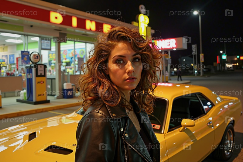 Портрет женщины, стоящей возле желтого мускульного автомобиля ночью