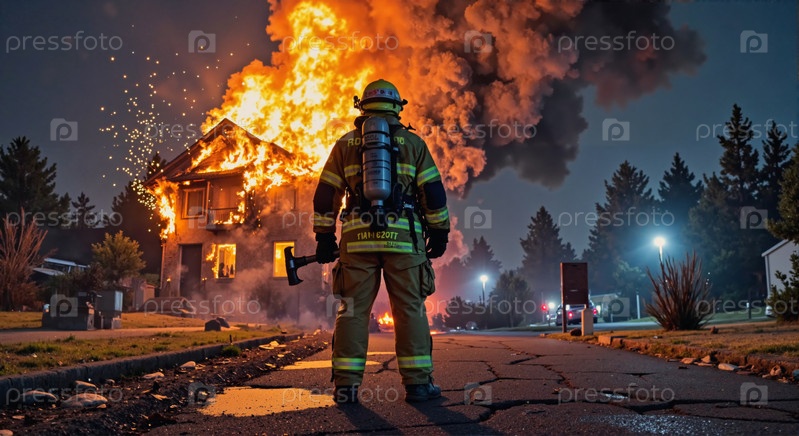 Пожарный борется с интенсивным пожаром дома ночью