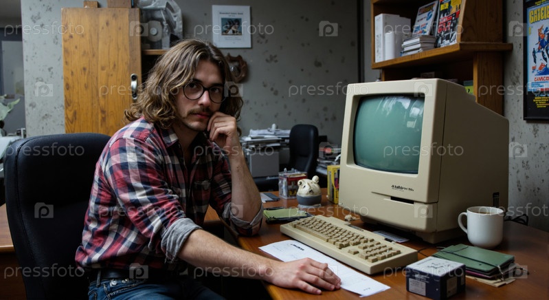 Мужчина сидит за старым компьютером в офисной обстановке
