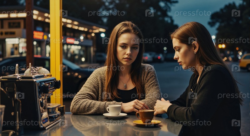 Женщины обсуждают в открытом кафе вечером