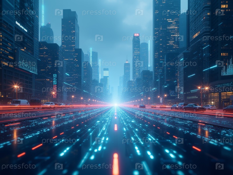 Неоновые огни отражаются на мокрой улице между небоскребами