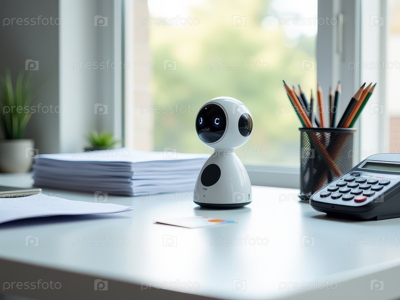 Роботизированное устройство на офисном столе с канцелярскими принадлежностями и калькулятором