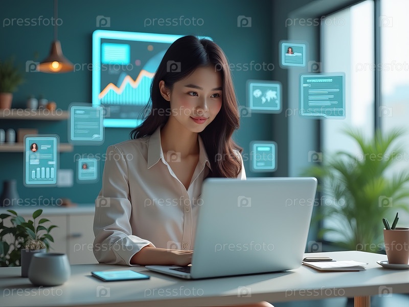 Портрет азиатской деловой женщины, анализирующей данные на ноутбуке