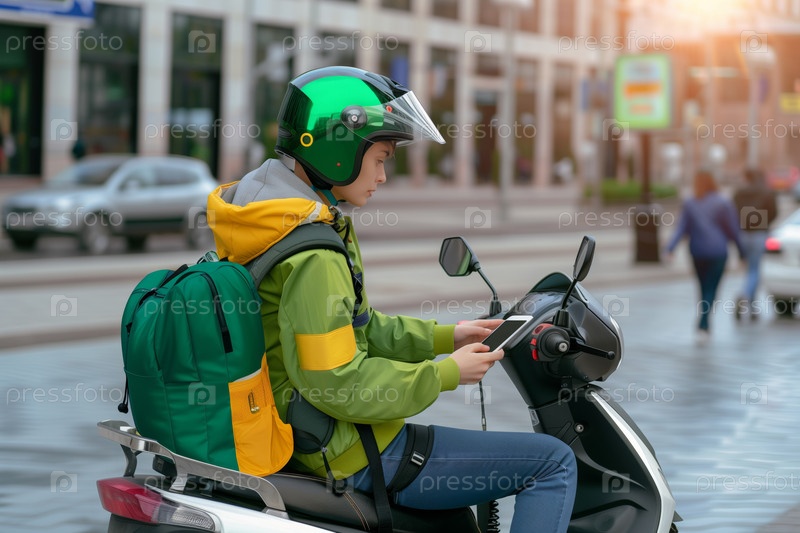 Проверка мобильного телефона, сидя на скутере возле городской улицы