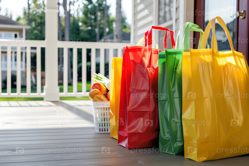 Красочные сумки для покупок на деревянном крыльце под солнечным светом