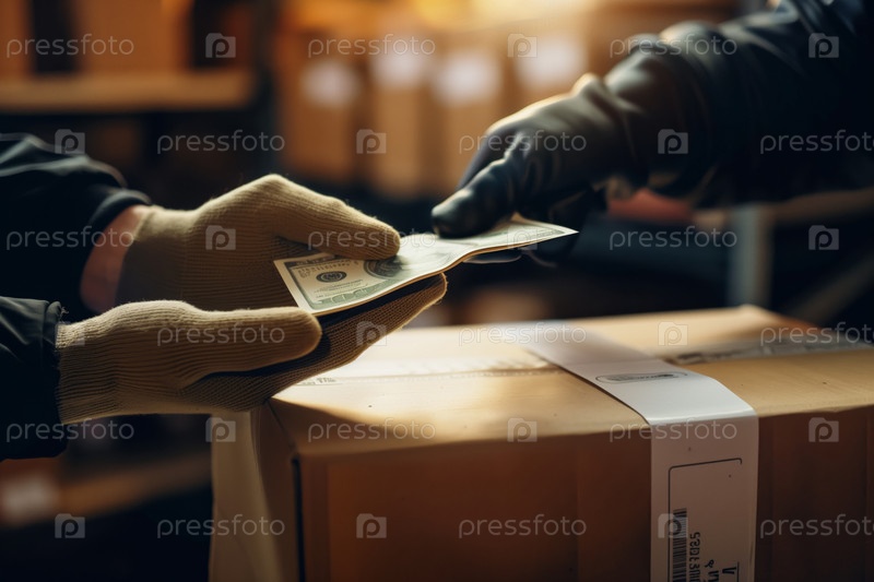 Работник обрабатывает посылку и получает оплату в перчатках