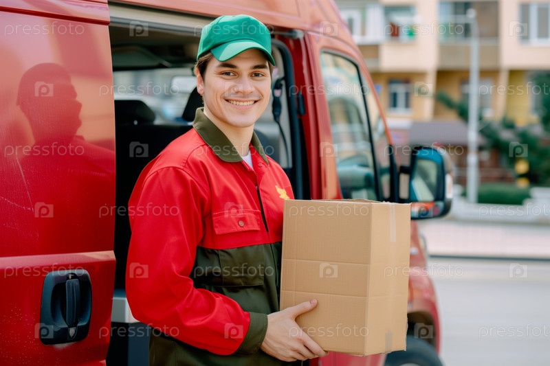 Улыбающийся работник доставки, держащий пакет на открытом воздухе