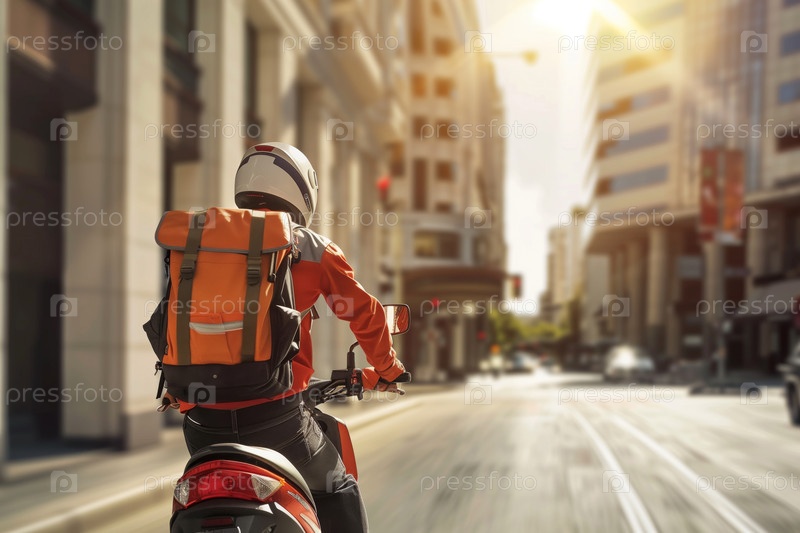 Мотоциклист едет по городской улице днем