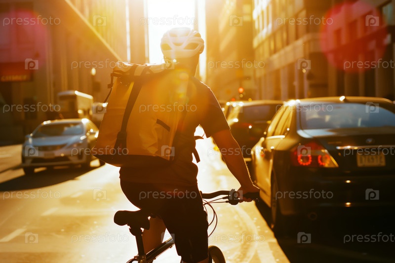 Доставка еды на велосипеде во время захода солнца в городских условиях