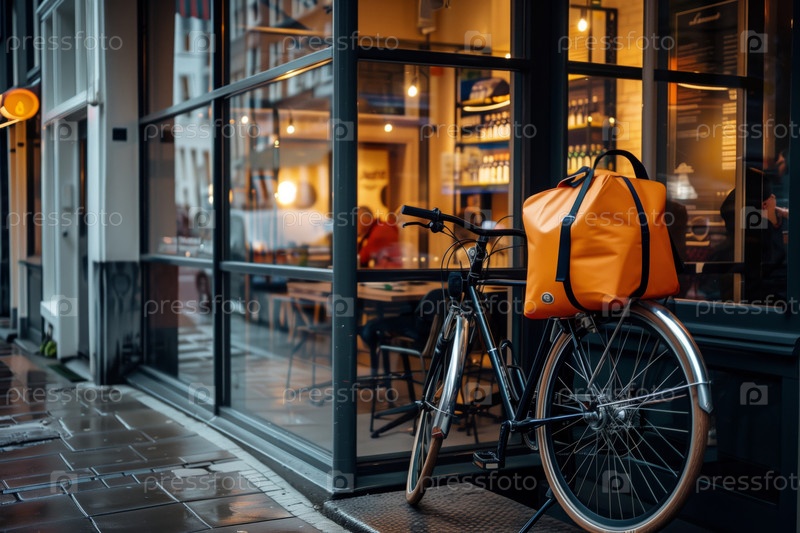 Велосипед с рюкзаком возле оживленного городского кафе в Dusk