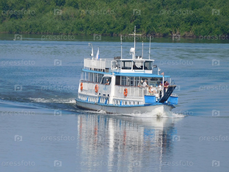 Пассажирское судно мирно плывет по спокойной реке на фоне зеленого леса