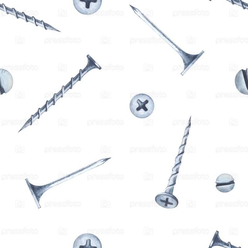Акварель бесшовный узор с гвоздями и шурупами на белом фоне. Акварельная иллюстрация. Идеально подходит для упаковки, обоев, оберточной бумаги