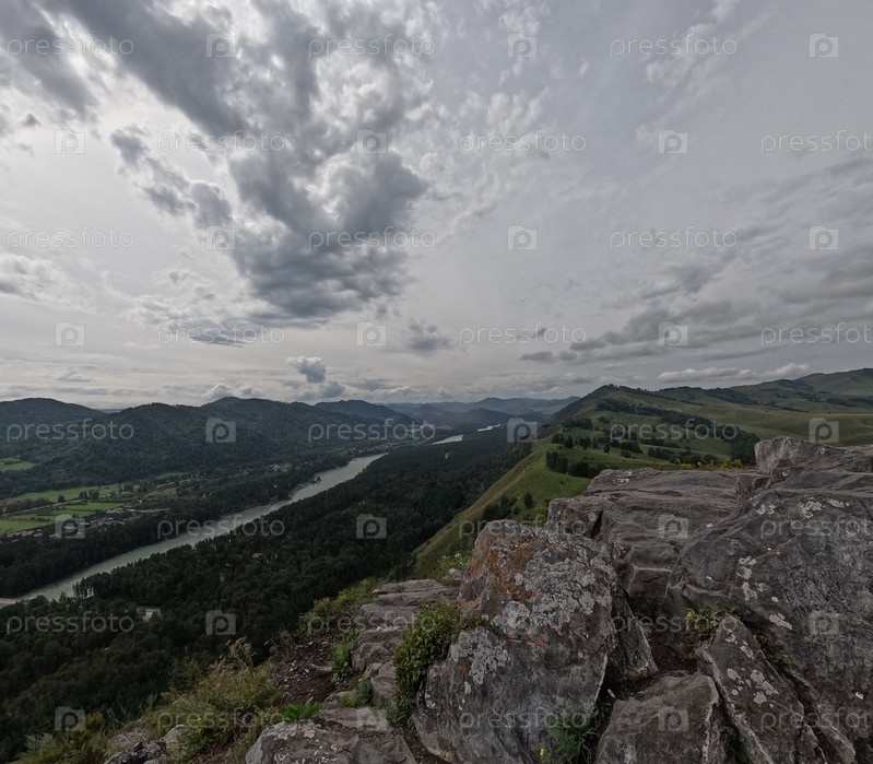 Вид со скалы Чертов Палец на реку Катунь, Горный Алтай. Лето. View from the Devil's Finger cliff, Altai Mountains. Summer