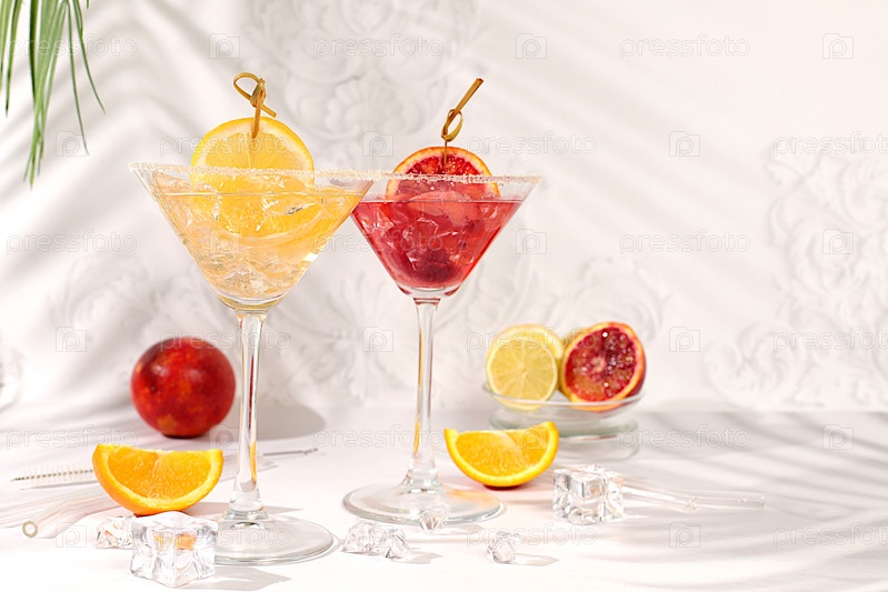 Коктейли Мартини с лимоном и апельсином, кубиками льда, ромом и текилой. Летняя вечеринка и концепция праздника. Баннер с алкогольными напитками и тропическими фруктами. Меню для бара или кафе