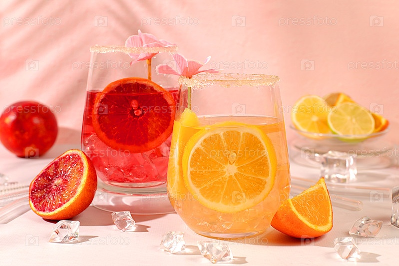 Королевский коктейль из апельсина, лимона и лайма, кубиков льда, рома и текилы. Флаер с бокалом алкогольного напитка и тропическими фруктами. Концепция летней вечеринки. Меню для бара или кафе