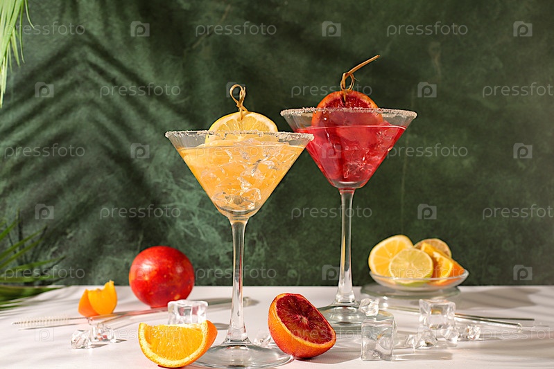 Коктейли Маргарита с лимоном и апельсином, кубиками льда, ромом и текилой. Летняя вечеринка и концепция праздника. Баннер с алкогольными напитками и тропическими фруктами. Меню для бара или кафе